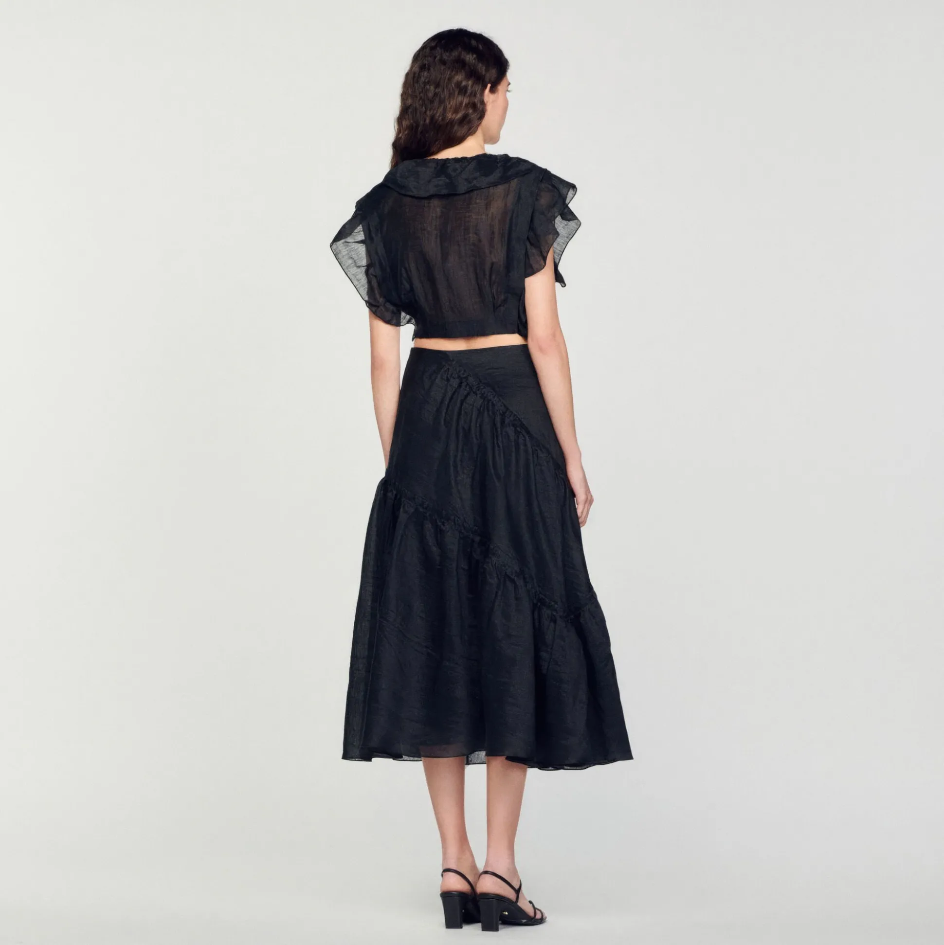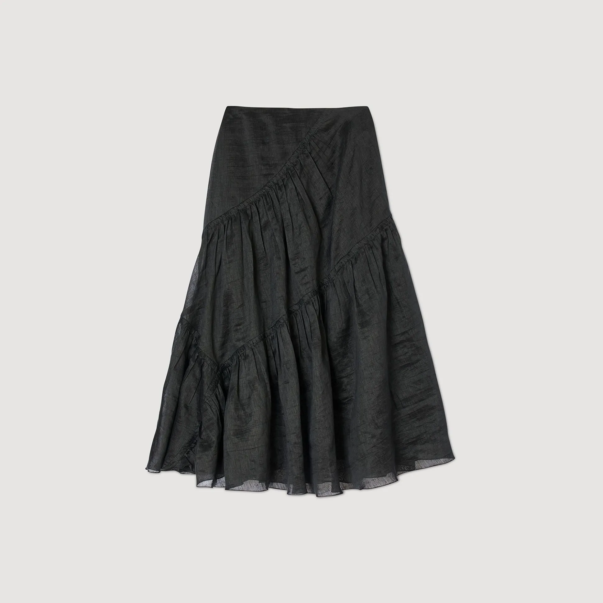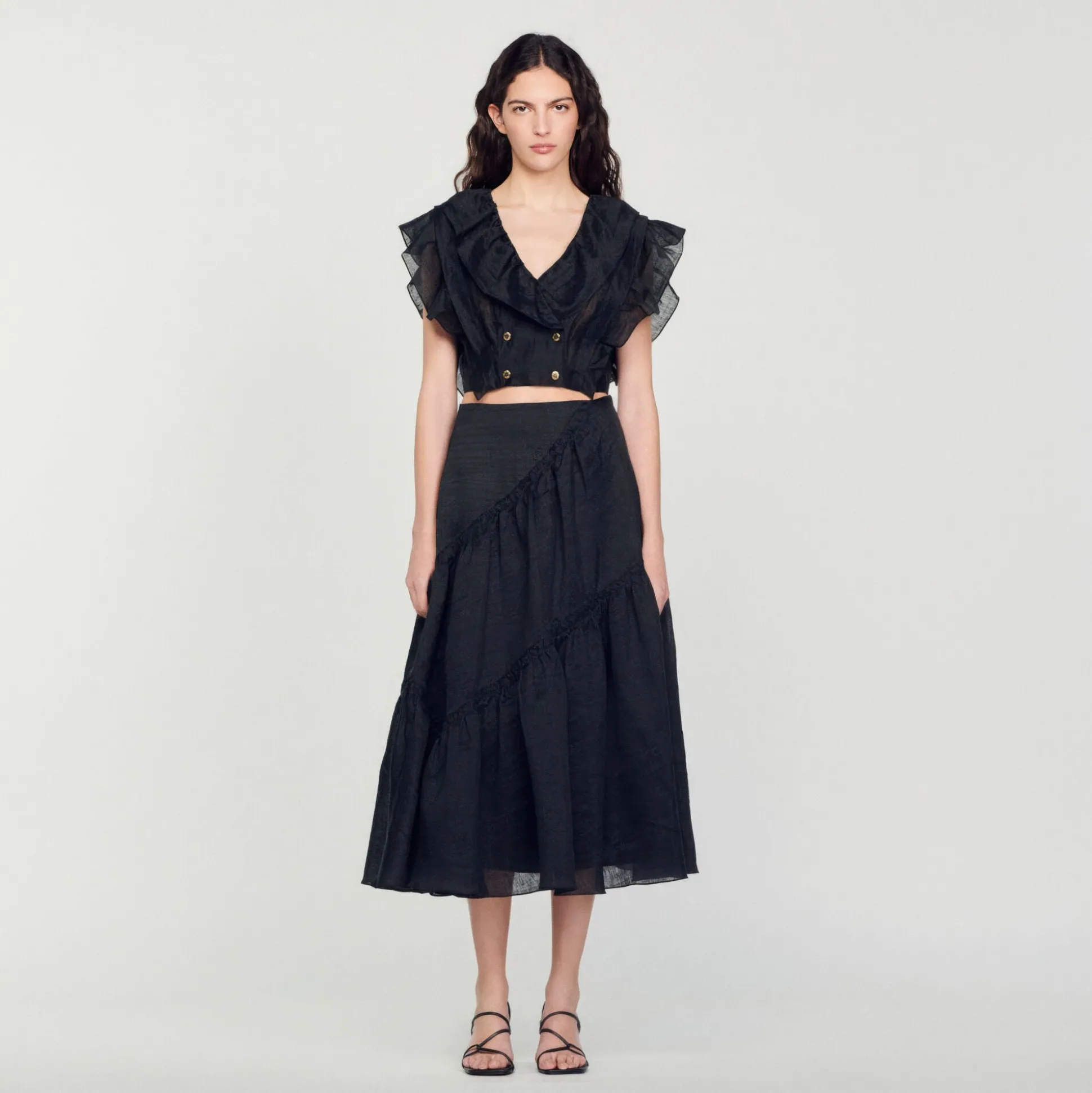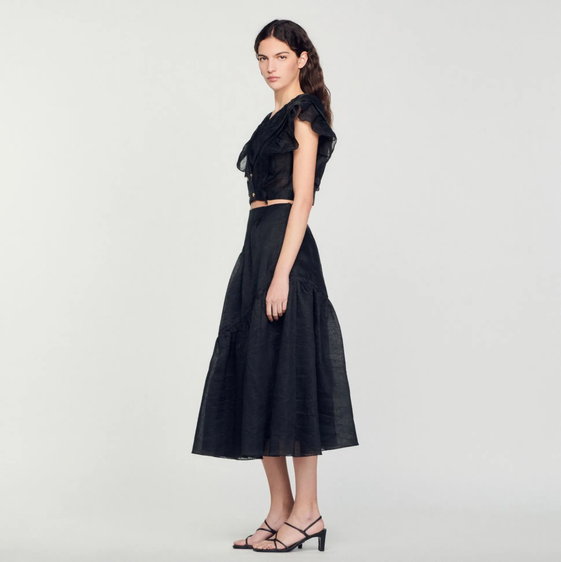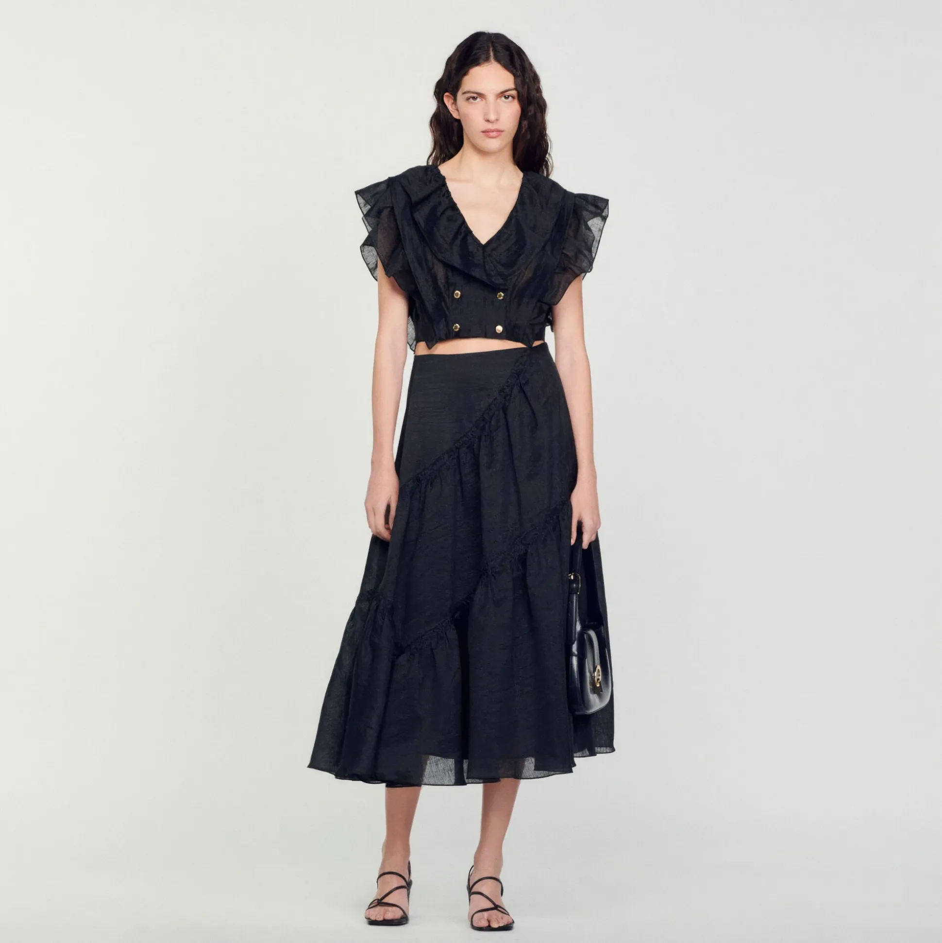 Saia Longa Levemente Larga Com Babados E Franzidos E Fechamento Por Zíper Na Lateral.Saia Longa Sandro Feminina Fechadu…
